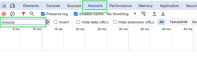 - Once the Developer Tool Box opens in the browser, go to the network tab and in the search bar enter 'choozle'.