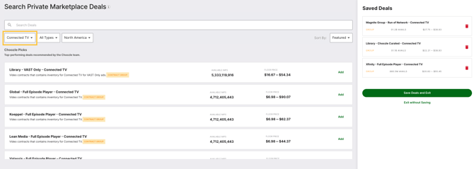 - Use the search function to narrow your search results of connected tv Private Marketplace deals. It is important to note that inventory availability and floor prices are subject to change. When selecting connected TV private marketplace deals, it is important to ensure the size of the available inventory. Contract groups include hundreds of quality Connected TV deals grouped based on a category or related inventory types to achieve maximum reach.