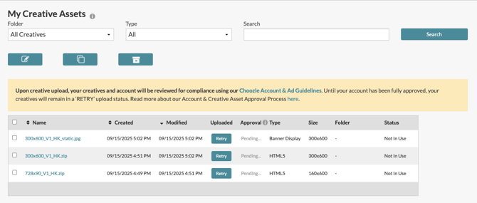 For new accounts, we require a manual audit of new advertisers and their creative assets before they can be used in a campaign. Assets will be reviewed within one business day. While we review your account, you can upload creatives but they will remain in a RETRY upload state until your account has been approved by our Marketplace Quality team.