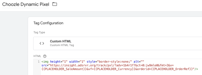 - Copy the Choozle Dynamic Tracking Pixel code snippet and paste into the HTML field