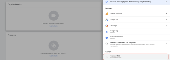 - Click Tag Configuration and select the Custom HTML option under the 'Custom section'